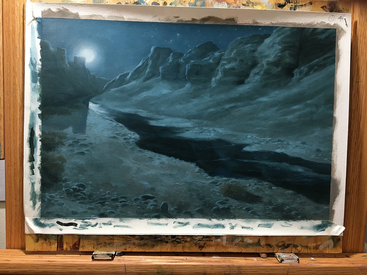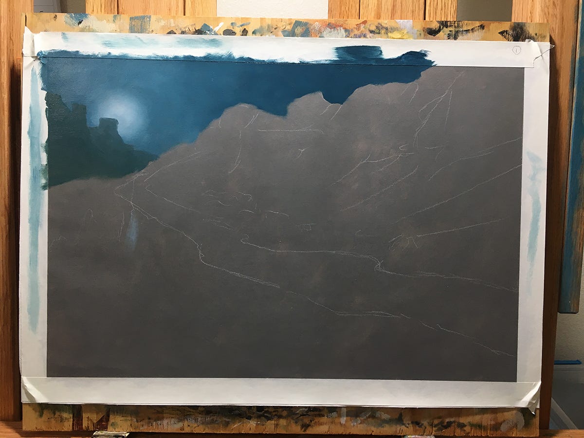 I could have saved a little more time with straight monochrome grayscale painting, since painting in one color is always faster than a full palette since there are fewer choices and adjustments. So I opted for this middle-ground. Thus, the paintings themselves are essentially temperature-controlled value studies, and in large part do not pop as the color images would.