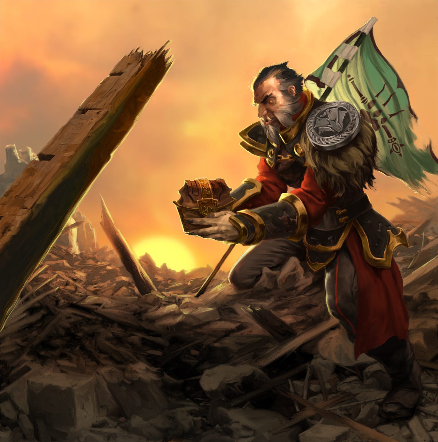 Though I was going to work digitally here, I began with a black and white traditional study. This has often helped my digital work, even as my development with digital tools has grown over the years. I have the art description here as: Lycan looks through the rubble of a noble house with the banner of Slom behind him. He has retrieved a mysterious lacquered box.