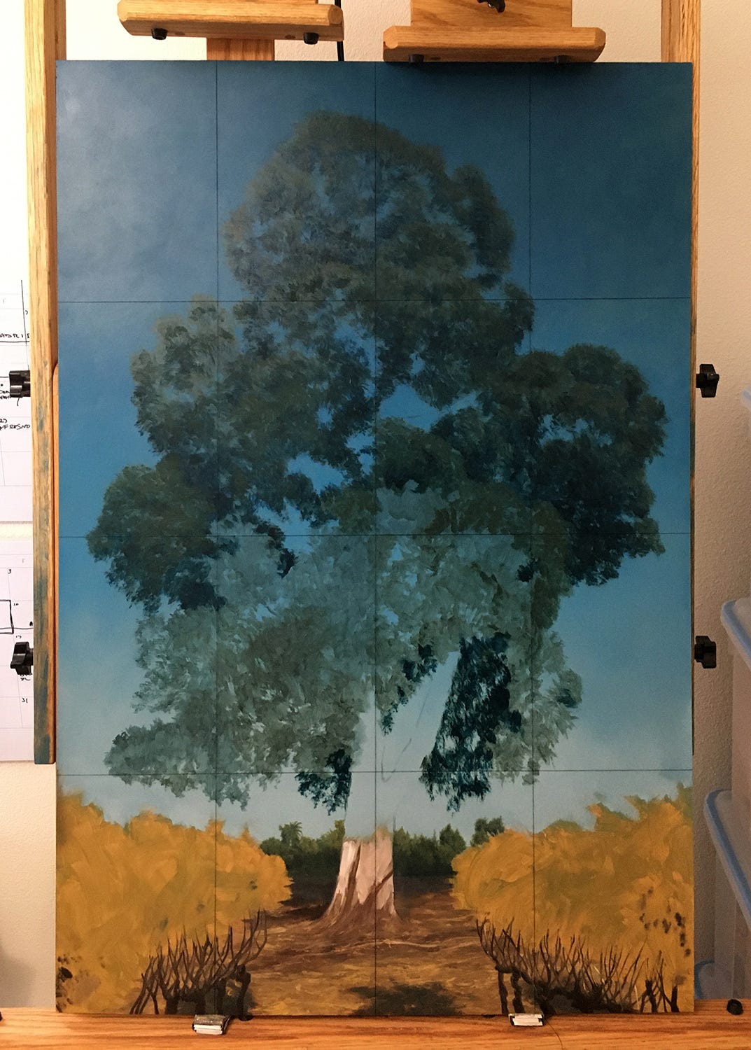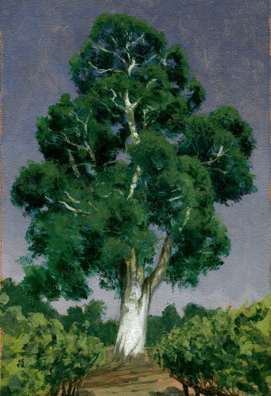 I ran across this majestic eucalyptus tree in the Napa Valley area while taking reference photos for what was intended to be a different painting that I haven’t moved much further on. What struck me most about this tree was the feeling I got standing in front of it. That’s a difficult thing to communicate in paintings, which can be viewed small, and will be viewed small by most who view it—including on your computer screen, like now.
